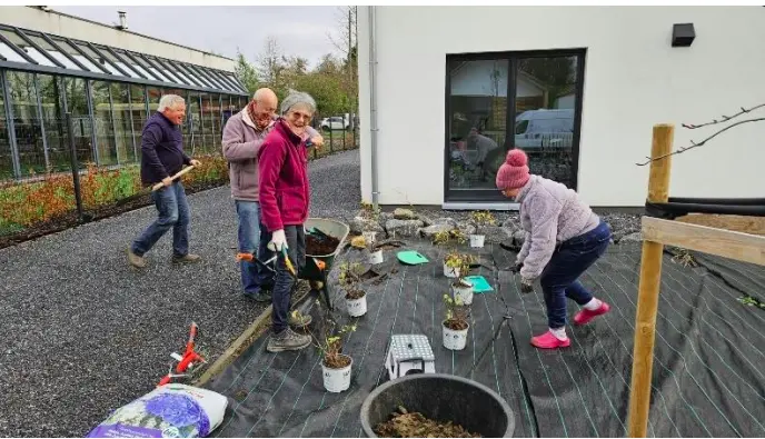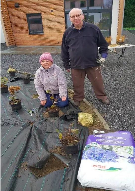 Une remorque remplie de plantes et d’arbustes sur le parking. Des béguiins et béguines bien emmitouflés par cette belle journée d’automne frâiche et ensoleillée. Soudain tout s’anime, l’effervescence monte, un bruissement, des éclats de voix. Et comme un ballet bien réglé, tout se met en place. Déchargement de la remorque, disposition des plantes selon un schema bien préparé, découpe de la bâche de protection, creusage des trous, amendement de la terre, plantation. Jolie chorégrahie entre les participants.